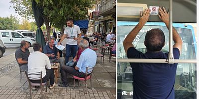 Muş İl Sağlık Müdürlüğü ekipleri, toplu taşıma araçları ve vatandaşların yoğun bulunduğu alanlarda bilgilendirme yaparak..